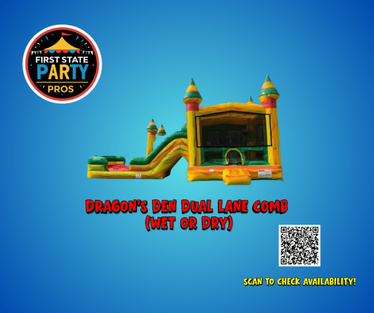 Dragon's Den Dual Lane Comb (Wet or Dry)Mega Jump Trio:Dragon's Den Dual Lane Comb (Wet or Dry)103045931_3048021_27121710100 DELIVERY: We deliver to Dover and surrounding areas (delivery fees calculated at checkout).COUPONS: Click here to check for couponRAIN POLICY: You can reschedule your rental due to rain at no extra cost as long as 24 hour notice is given. A maximum of 5-6 kids of equal size at one time for bounce houses, and 1 person at a time for slides is what most inflatable manufacturers recommend.OCCUPANCY: CLEANING: All units are cleaned and sanitized before use.WHAT'S INCLUDED: - Extension Cord