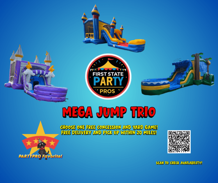TEXT USFiery Sky Dual Lane Combo (Wet or Dry)Mega Jump Trio:Fiery Sky Dual Lane Combo (Wet or Dry)103045931_3048021_27121750100 DELIVERY: We deliver to Dover and surrounding areas (delivery fees calculated at checkout).COUPONS: Click here to check for couponRAIN POLICY: You can reschedule your rental due to rain at no extra cost as long as 24 hour notice is given. A maximum of 5-6 kids of equal size at one time for bounce houses, and 1 person at a time for slides is what most inflatable manufacturers recommend.OCCUPANCY: CLEANING: All units are cleaned and sanitized before use.WHAT'S INCLUDED: - Extension Cord