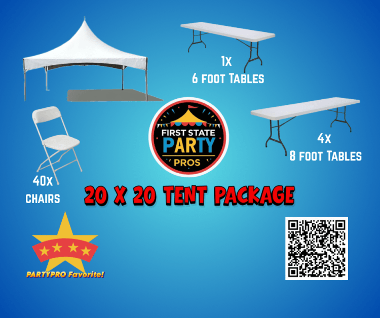 6ft Rectangle Tables20 x 20 Tent Package:6ft Rectangle Tables1Dropdown12879161_27120670100These 6ft rectangle tables offer a durable and versatile setup for a variety of events. Perfect for dining, meetings, or display arrangements, they serve as a reliable stage for gatherings big or small. White Folding Chair20 x 20 Tent Package:White Folding Chair1002879161_2712067_27120590000This crisp, white folding chair offers practical comfort for any setting. Light, portable, and easy to set up, it's an ideal seating solution that fits seamlessly into events, meetings, or any space in need of extra chairs. - Black Spandex Chair Cover20 x 20 Tent Package:Black Spandex Chair Cover102879161_2712059_28792931000The Black Spandex Chair is a stylish seating option featuring a smooth, flexible finish that makes a bold statement. Its sleek design suits a range of events, offering a modern twist to your rental setup while ensuring comfort and durability wherever it's placed.